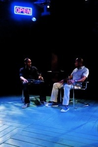 “...The production is truly outstanding...Take Me Out marks the first time that Celebration Theatre brings us a production “in the round,” with audience on all four sides of a raised stage...this particular production realizes the full potential and versatility of the 64-seat space...Kurt Boetcher’s production design is great. Floodlights and foliage places the audience literally in the playing field. The clubhouse lockers line one wall while center stage is constantly transformed into night club, to business offices, to showers. Veronica J. Lancaster, in concert with Tim Swiss, creates an exciting palette of sound and light that is both judicious and evocative. All elements of this production are clean, precise, deliberate, measured and executed with utter refinement. Well Done.”